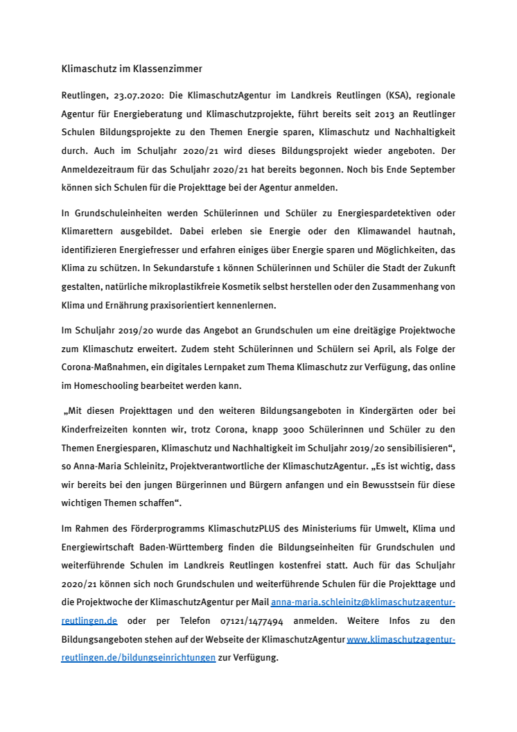 Die KlimaschutzAgentur im Landkreis Reutlingen führt bereits seit 2013 an Reutlinger Schulen Bildungsprojekte zu den Themen Energie sparen, Klimaschutz und Nachhaltigkeit durch. Auch im Schuljahr 2020/21 wird dieses Bildungsprojekt wieder angeboten. Der Anmeldezeitraum für das Schuljahr 2020/21 hat bereits begonnen. Noch bis Ende September können sich Schulen anmelden.