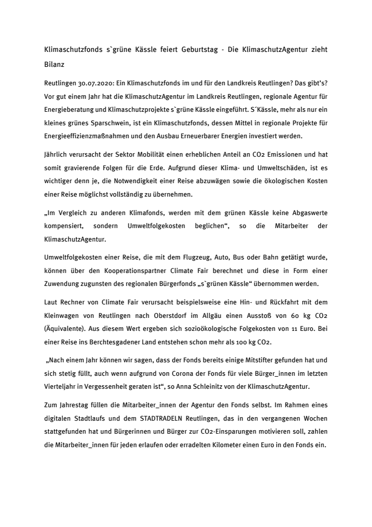 Klimaschutzfonds s`grüne Kässle feiert Geburtstag - Die KlimaschutzAgentur zieht Bilanz