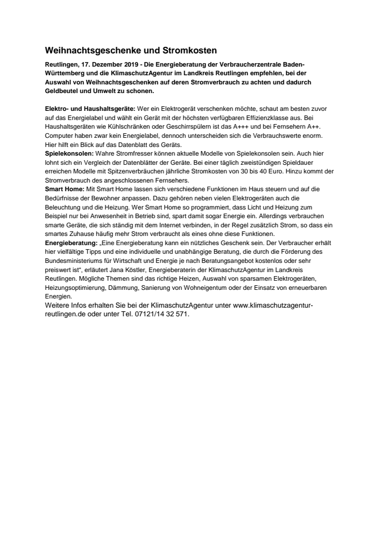 Energieberatung: „Eine Energieberatung kann ein nützliches Geschenk sein. Der Verbraucher erhält hier vielfältige Tipps und eine individuelle und unabhängige Beratung, die durch die Förderung des Bundesministeriums für Wirtschaft und Energie je nach Beratungsangebot kostenlos oder sehr preiswert ist“, erläutert Jana Köstler, Energieberaterin der KlimaschutzAgentur im Landkreis Reutlingen. Mögliche Themen sind das richtige Heizen, Auswahl von sparsamen Elektrogeräten, Heizungsoptimierung, Dämmung, Sanierung von Wohneigentum oder der Einsatz von erneuerbaren Energien.